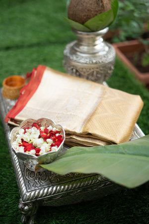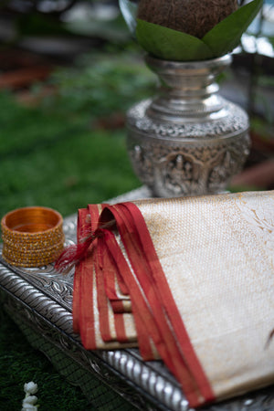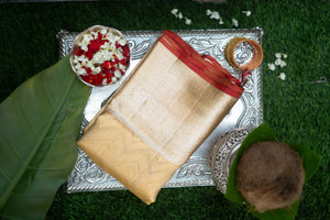 Premium Gold kanchipuram silk saree with red bordered and gold zari.