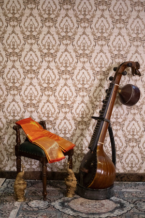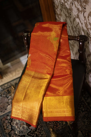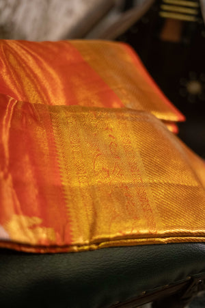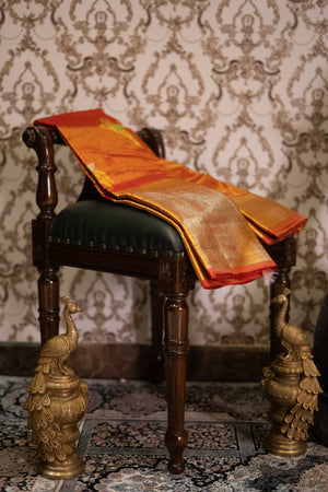 Premium Orange Kanchipuram silk saree with a gleaming gold border.\