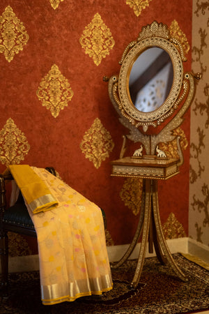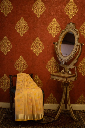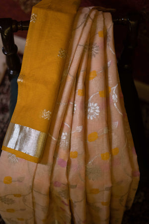 Premium Peach and yellow pure zari Kota Doria silk saree with an elegant charm.