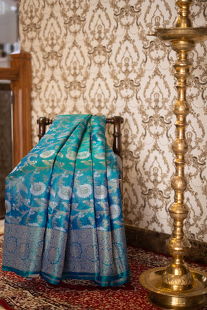 Peacock Blue Pure Kanchipuram Bridal Silk Saree with Floral Jacquard Design on the Body with Zari Border