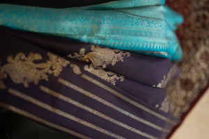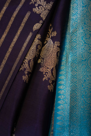 Peacock blue and indigo Kanchipuram silk saree with exquisite zari work.