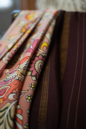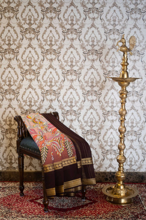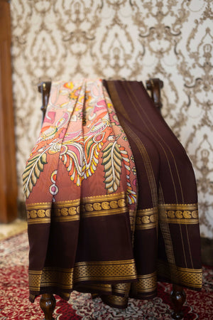 Vibrant-hued Mysore silk saree with a rich brown border and intricate Kalamkari work.