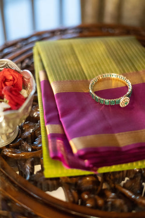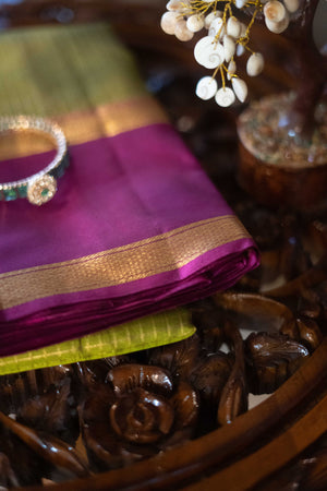 Expertly handwoven, the Pure Kanchivaram Saree features a vibrant green color with intricate gold zari stripes. Its stunning magenta border adds a pop of contrast, making it a timeless and elegant addition to any wardrobe. Perfect for special occasions or everyday wear.